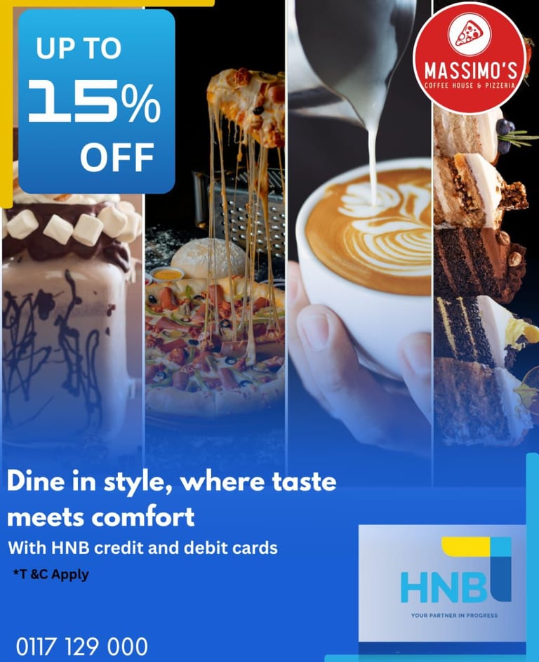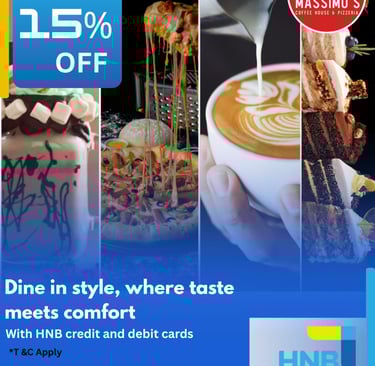 Good vibes, great food, and ๐๐ฝ ๐๐ผ ๐ญ๐ฑ% ๐ข๐๐ when you pay with your HNB Card at ๐ ๐ฎ๐๐๐ถ๐บ๐ผโ๐ ๐๐ผ๐ณ๐ณ๐ฒ๐ฒ ๐๐ผ๐๐๐ฒ & ๐ฃ๐ถ๐๐๐ฒ๐ฟ๐ถ๐ฎ! Donโt miss out โ ๐น๐ถ๐บ๐ถ๐๐ฒ๐ฑ ๐๐ถ๐บ๐ฒ ๐ผ๐ป๐น๐!
