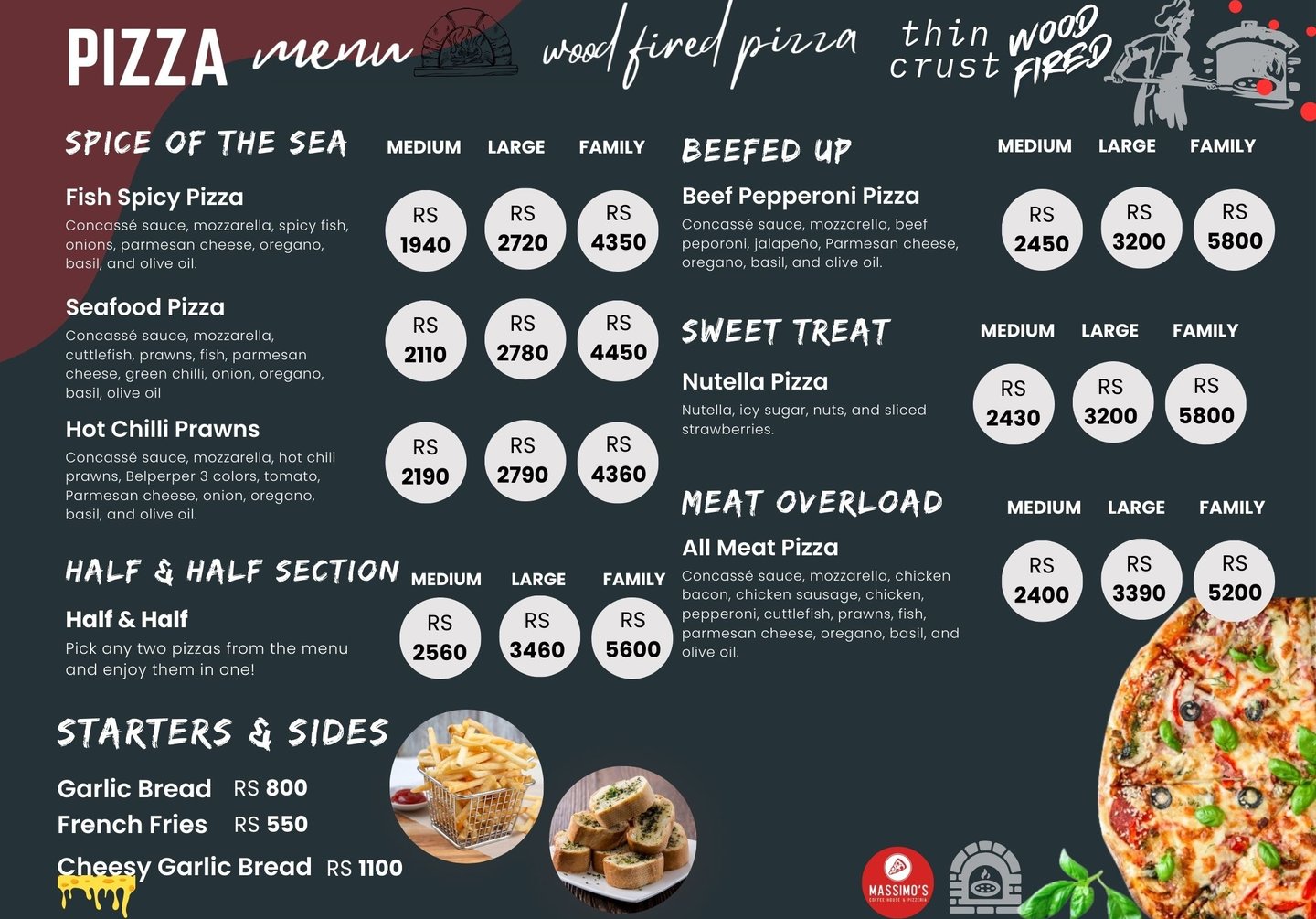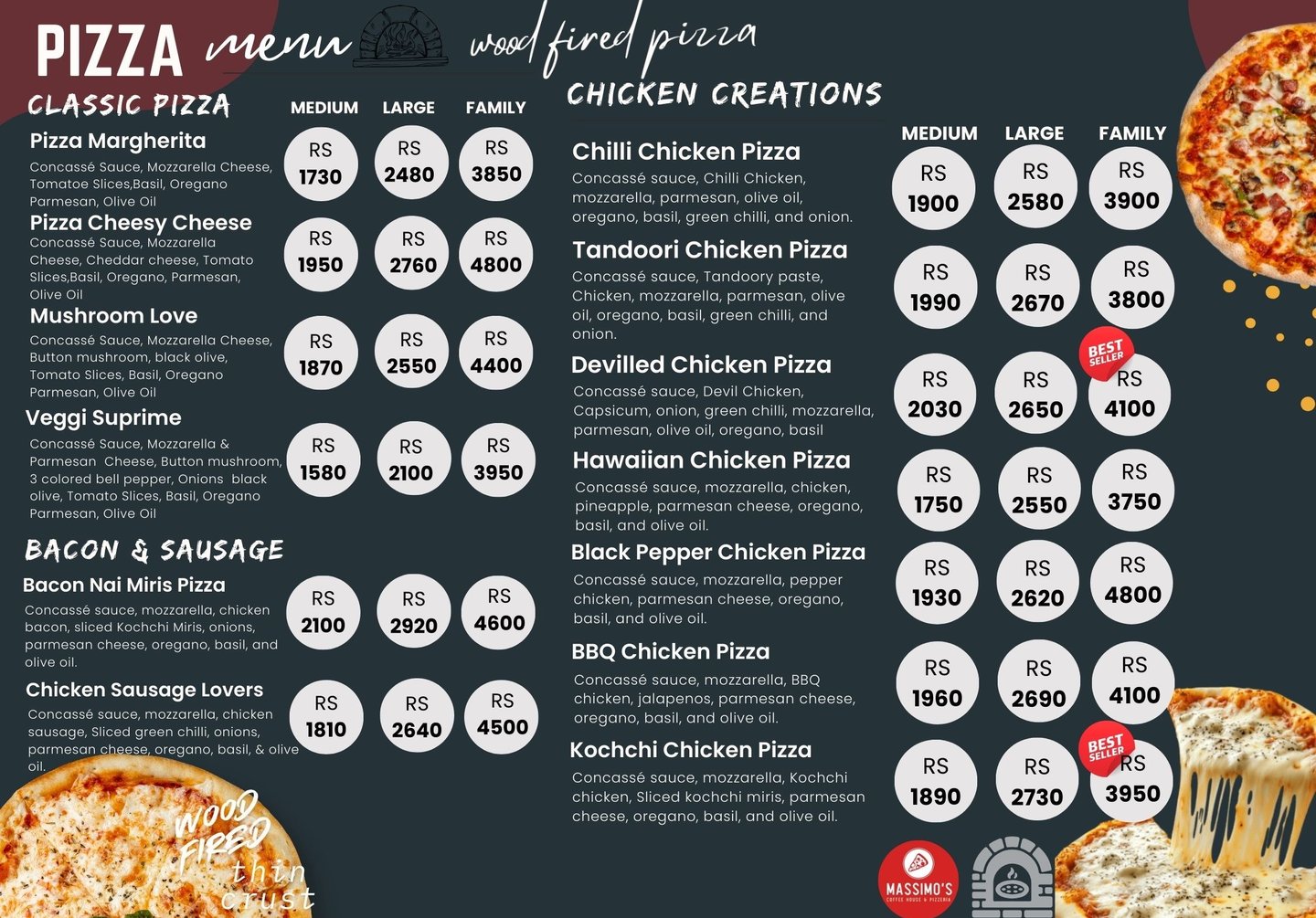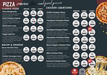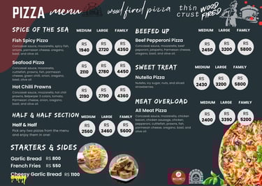 Below showcases our menu and its price list of all wood oven pizza varieties, carefully crafted to deliver the rich, smoky flavor only a traditional wood-fired oven can provide.